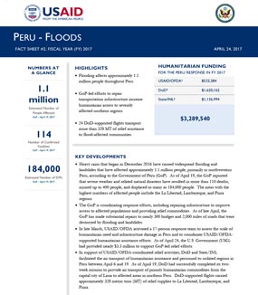 At the request of the Government of Peru, the U.S. military is providing logistics support for the relief efforts. In coordination with USAID, U.S. Southern Command provided two C-130 aircraft to facilitate the transportation of humanitarian cargo and personnel to hard-to- reach areas.